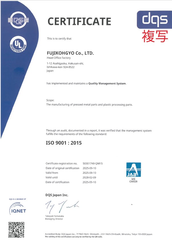 ISO 9001:2015 登録証