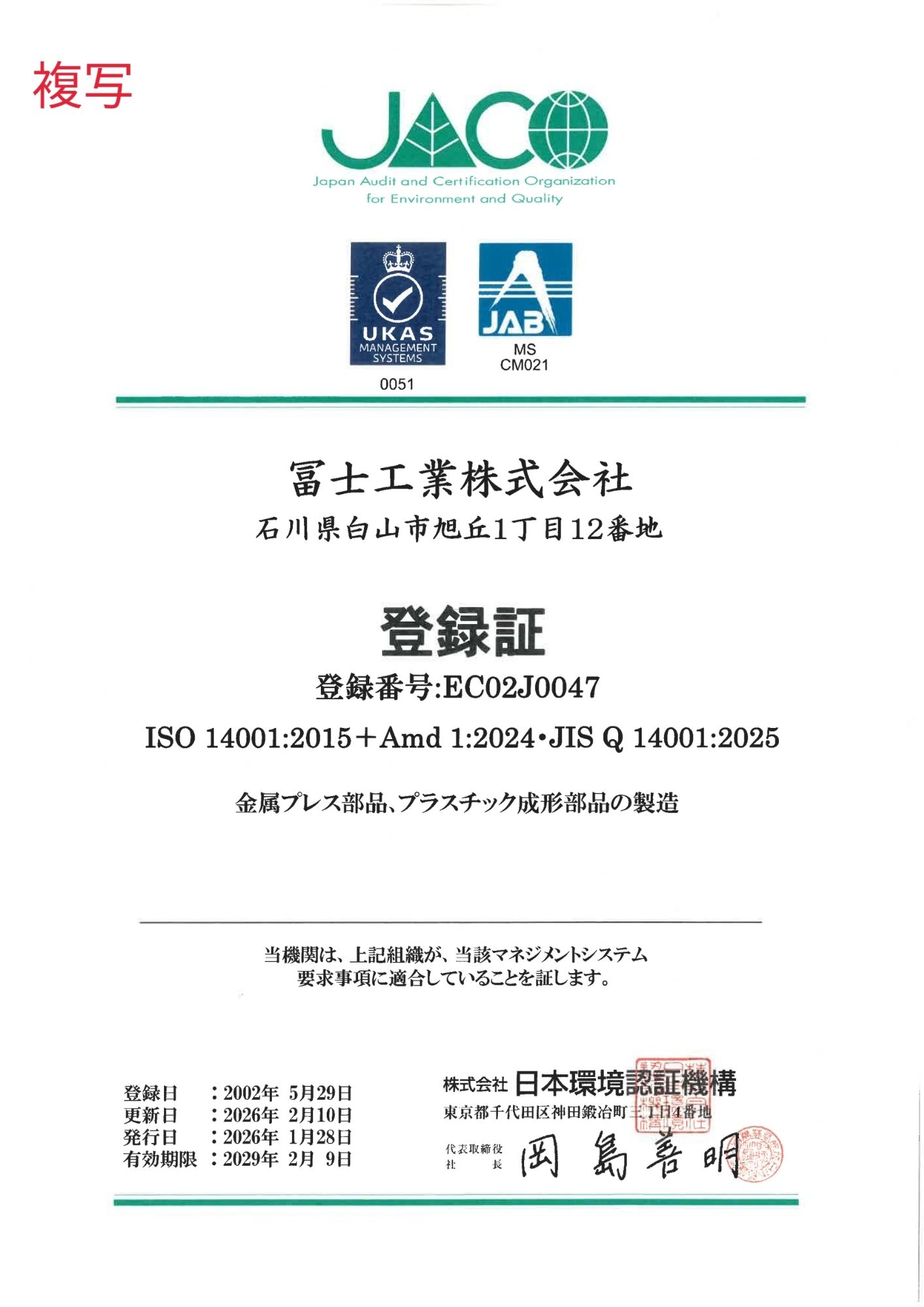 ISO 14001 登録証